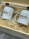 Unser Hochzeitsset "Mrs & Mr" besteht aus einer personalisierten Erinnerungskiste und zwei Tassen.