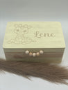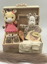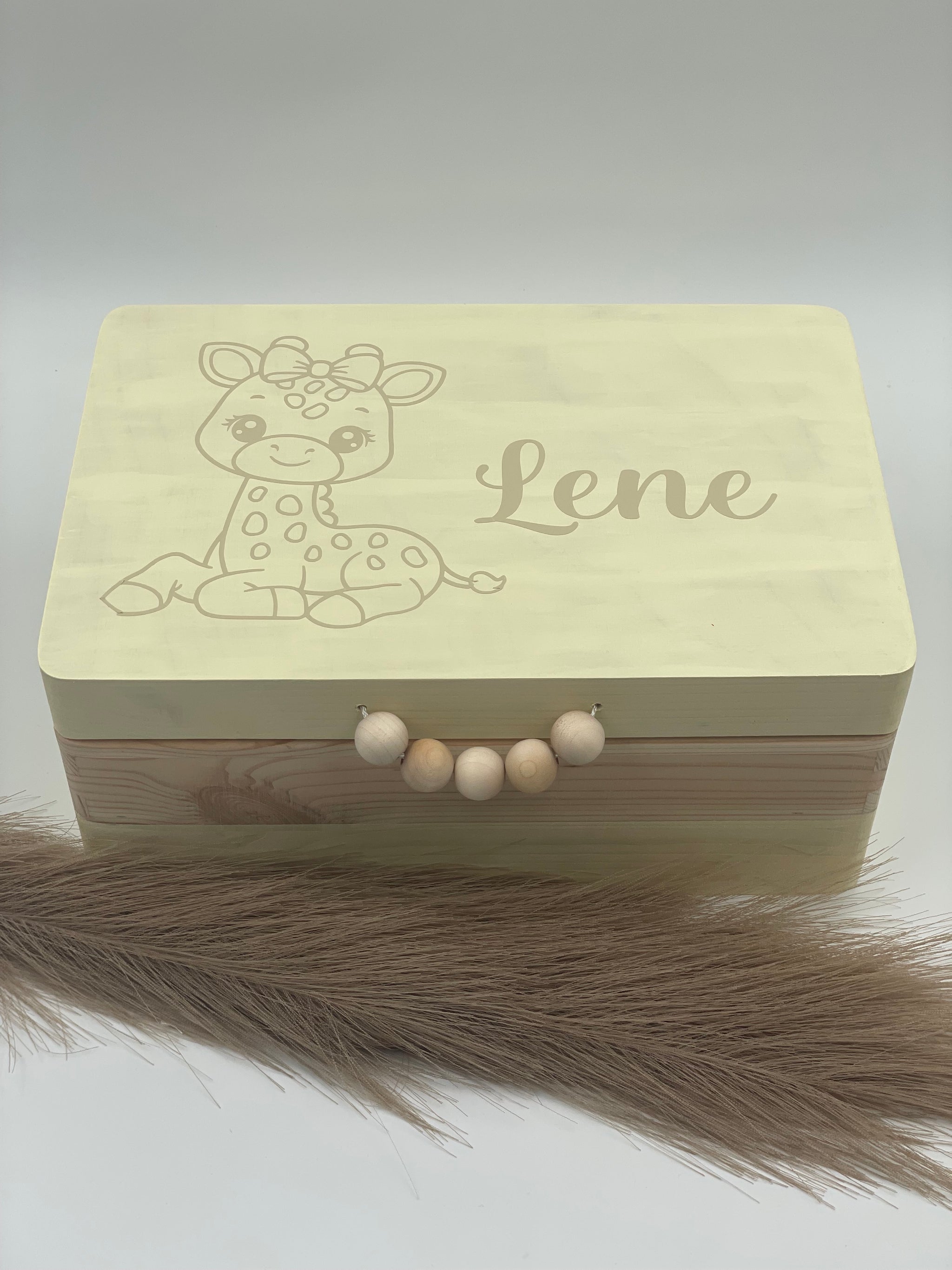 Unser Newbornset "Giraffe Mädchen" besteht aus einer personalisierten Erinnerungskiste, einem gehäkelten Kuscheltier, eine Buchstaben Spardose, einem Knistertuch, einer gehäkelten Haarspange, einer Babymütze mit Handschuhen, eine Babybürste und Krabbelschuhen.