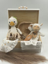 Unser Newbornset "kleine Ente" besteht aus einer personalisierten Erinnerungskiste, einem gehäkelten Kuscheltier, einem Knistertuch, einer Babymütze mit Handschuhen, eine Babybürste, ein Lätzchen, eine Buchstaben Spardose und Krabbelschuhen.